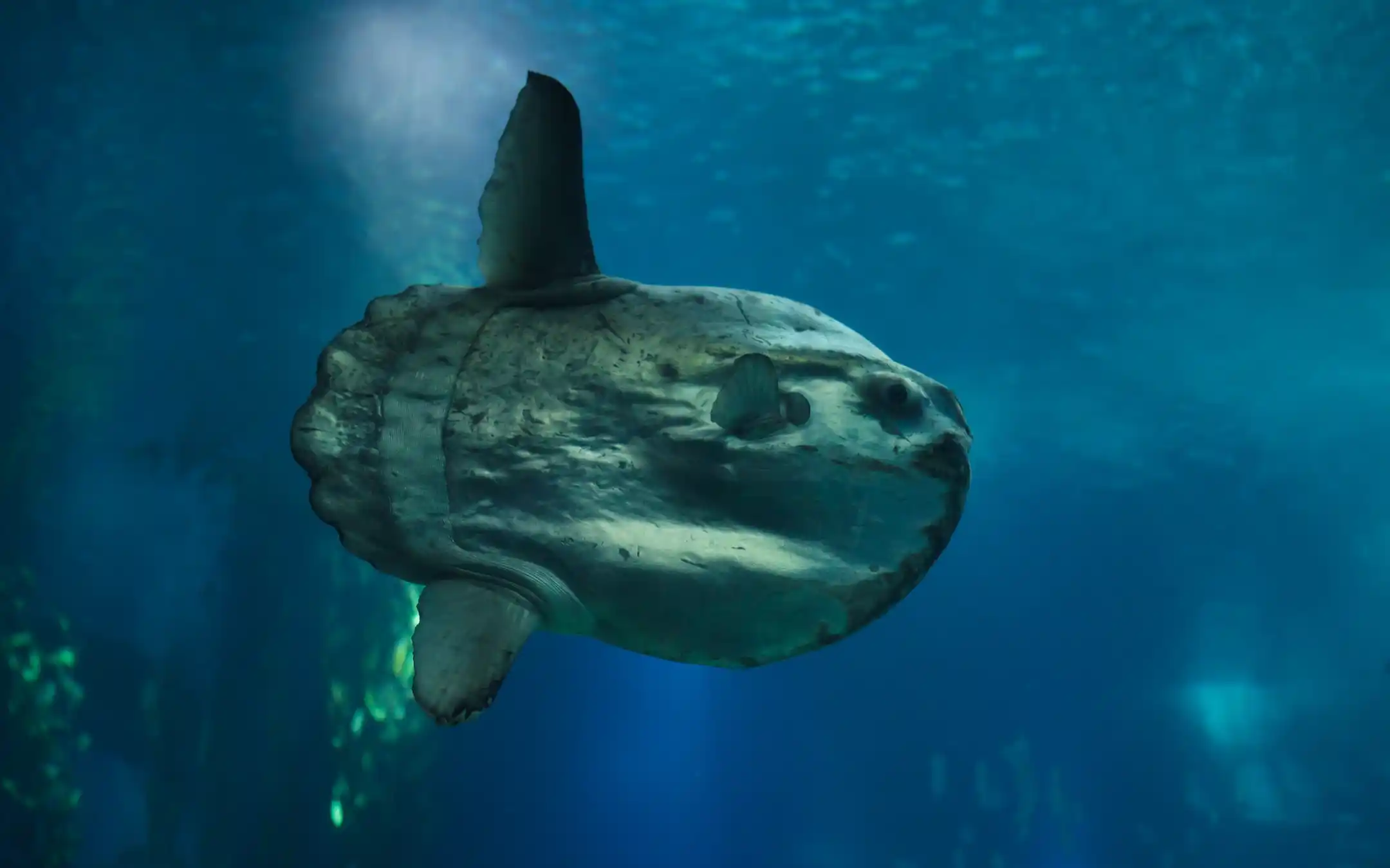 The ocean sunfish is one of the heaviest bony fishes in the world, reaching weights of over 2,000 kg. It has a flattened, disk-like body and lacks a true tail, instead using a structure called a clavus for propulsion.