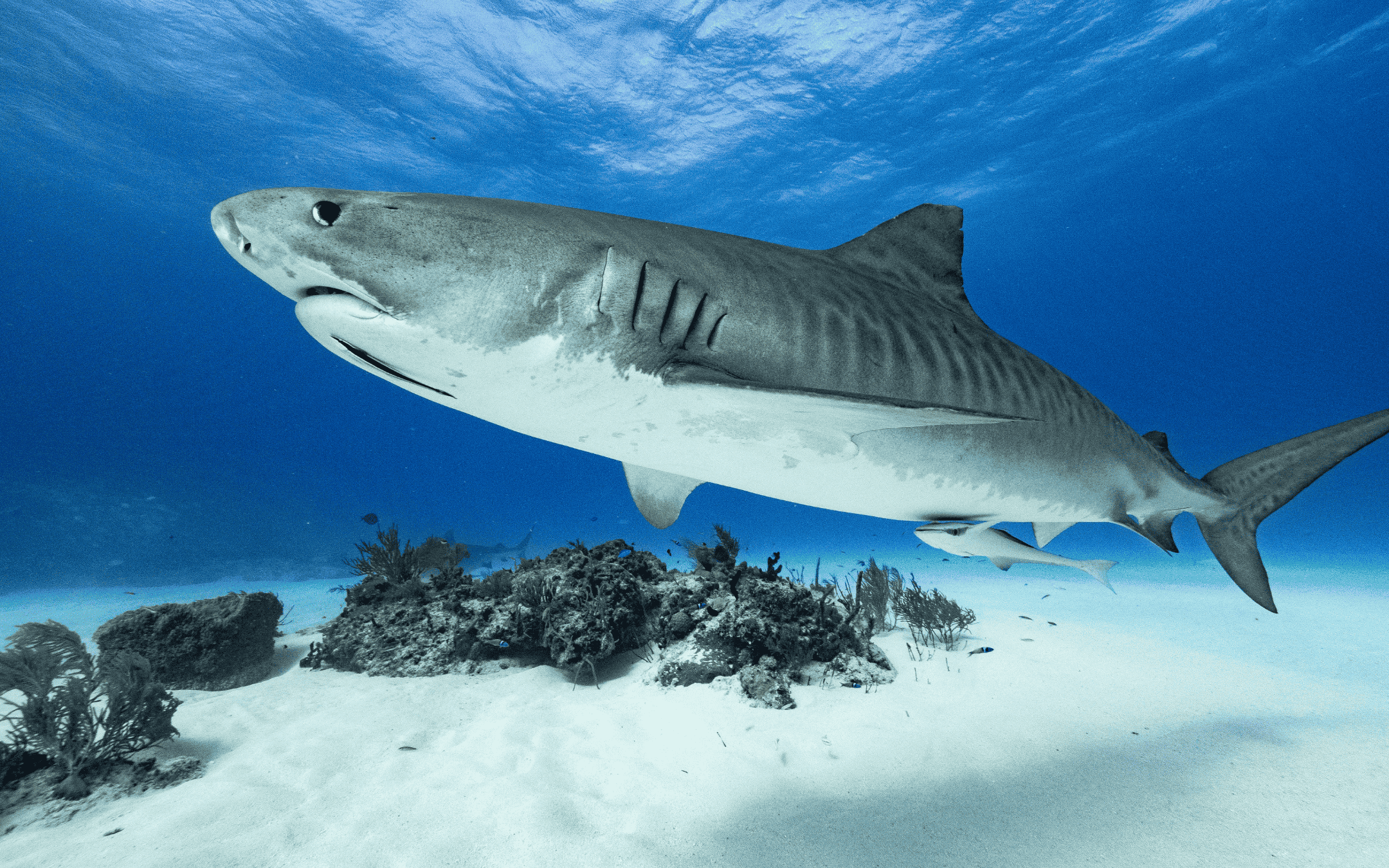As an apex predator, the tiger shark plays a key role in marine ecosystems through top-down regulation. By preying on sick, injured, or weaker animals, it helps maintain healthy prey populations.